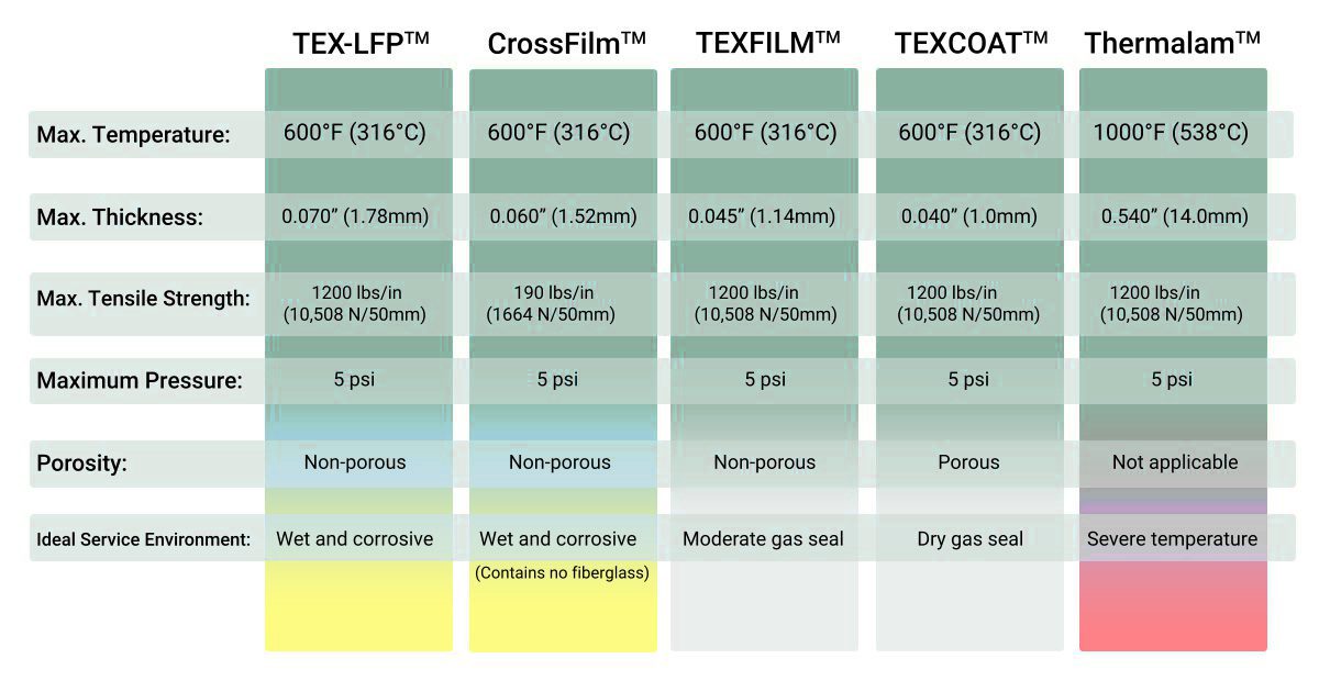A durable PTFE coating is applied to a rugged, continuous-filament fiberglass reinforcement. Three plies of high strength PTFE film are laminated to produce the CrossFilm™ barrier. The resulting PTFE barrier is rugged, flexible, and stress crack resistant. The typical thickness of film for a Texfilm product is 0.004" or 0.005". Variations can be engineered upon request.