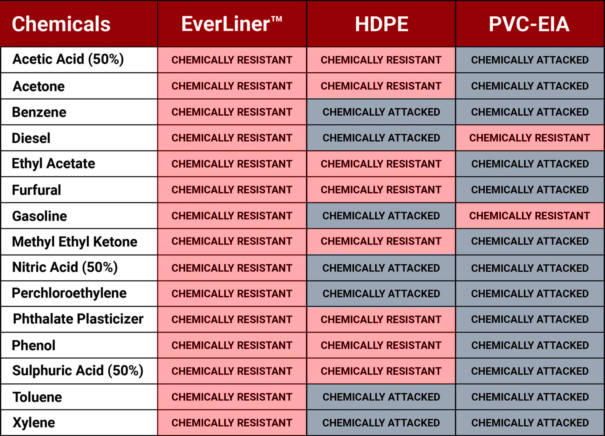 Compared to most companies who offer several material options for secondary spill containment, TCI only offers one material that delivers an unparalleled performance. EverLiner™ can withstand a wide range of temperatures, from -425°F (-254°C) to 600°F (316°C). EverLiner™ also comes in variety of available thicknesses between 0.003” (0.076 mm) and 0.060” (1.52 mm), making it the ideal solution for every conceivable type of tank and containment vessel. Because of its unique multidirectional strength and stress-crack resistance, EverLiner™ is a self-supporting material. Reinforcements, which are susceptible to chemical attack, are not needed. EverLiner™ has an unlimited shelf life and will not contaminate the surrounding environment. For lifetime containment, use EverLiner™ containment liners.