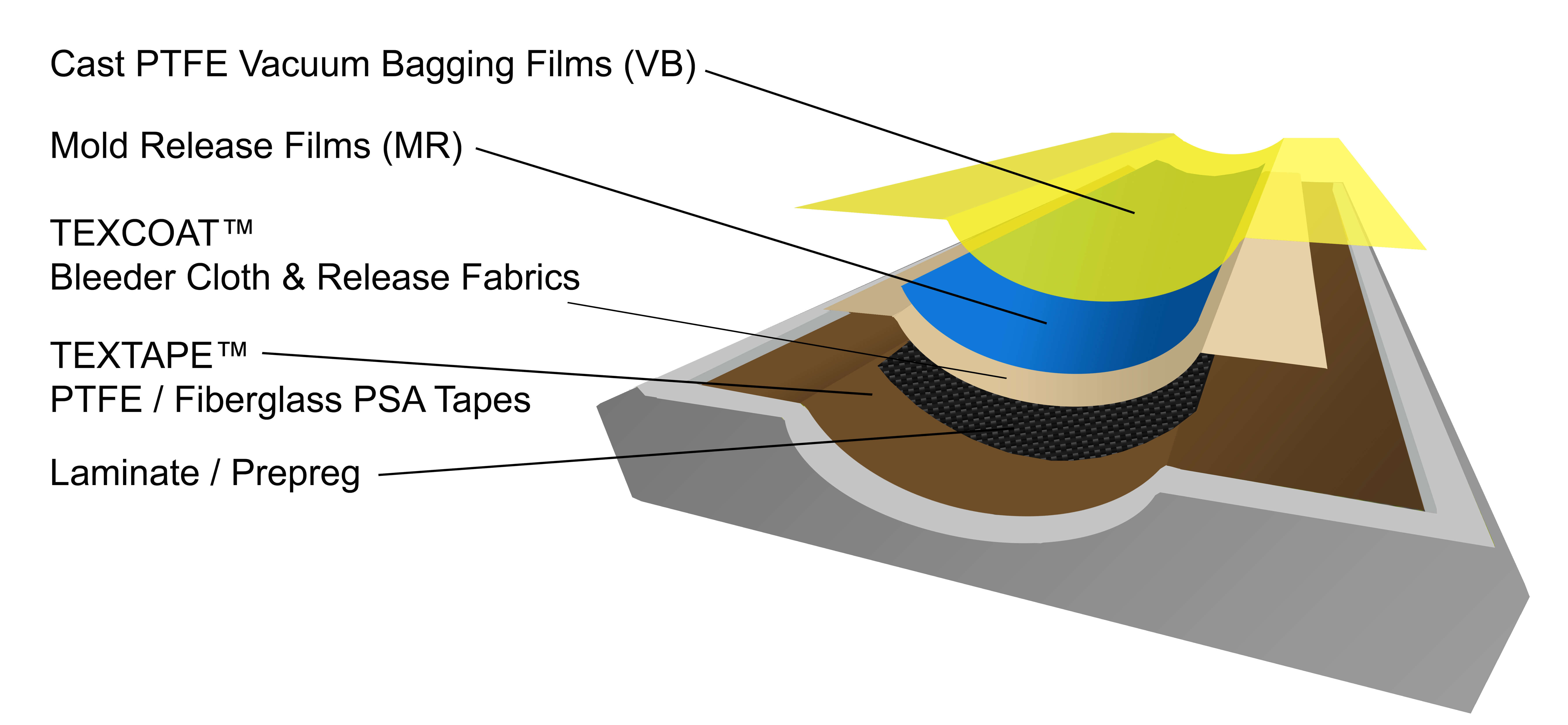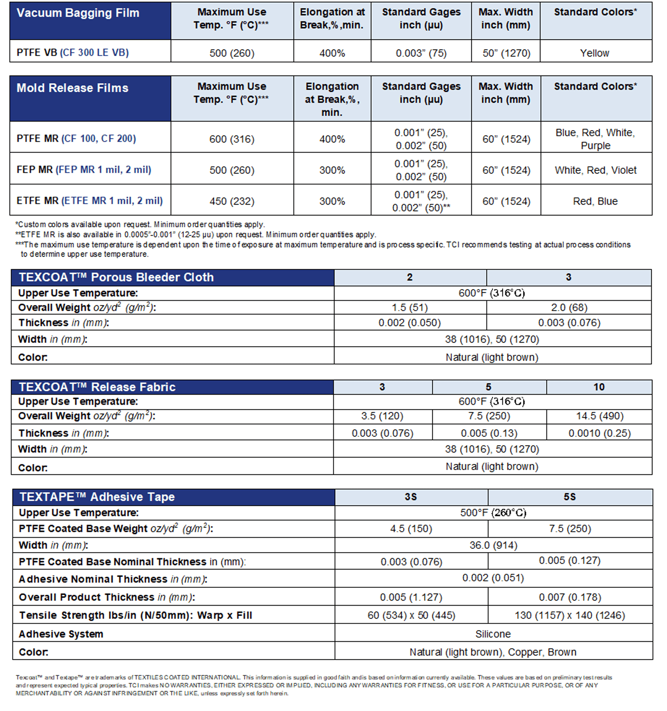 TCI offers a complete range of composite process molding materials and products for the high-end composite molding industry, including mold release (MR) and vacuum bagging (VB) films, PTFE coated fiberglass bleeder cloth, release fabrics, Edge Breathers, and breather fabrics. Our composite molding films are designed to withstand extreme temperatures while maintaining their release characteristics and are available in various colors to allow for easy identification. TCI’s mold release films (MR) for composite molding combine the chemical inertness and universal non-stick properties of PTFE polymers with maximum conformability and heat resistance. Our MR and VB films can withstand the highest temperatures in the composite molding temperature range, making them ideal for use in the aerospace, wind turbine, and automotive industries.